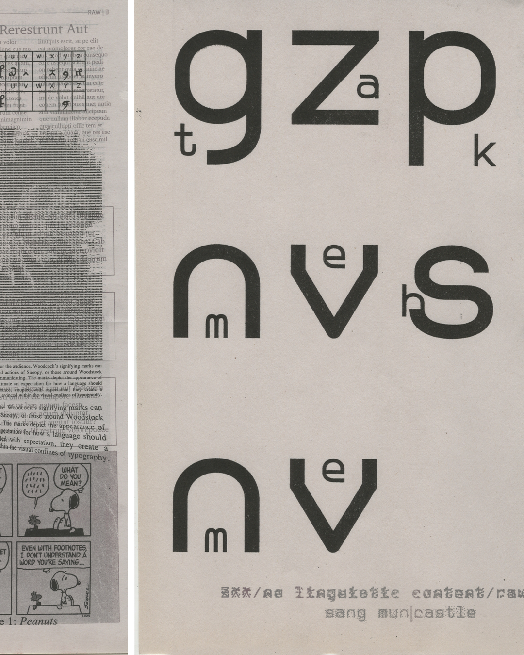 Newspaper project exploring the dynamic of asemic writing as a communicative method as well as an aesthetic theory; printed on full-size newsprint sheets on risograph.
