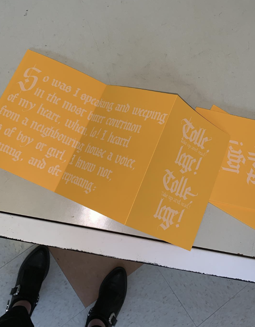 Above, from left to right: 2016, 2017, and 2018 editions of the Reed College Creative Review (RCCR). I designed the folio, cover, and did all layout.RCCR 2016 features gold embossment that imitates a circuit board, with corresponding folio designs. RCCR 2017 has a cut-out cover with correspondingly fragmented folio design. RCCR 2018 has a fold-out cover with a quote from St. Augustine’s Confessions calling for someone to “take up and read,” printed in iridescent ink. Calligraphy is a central theme in the layout design. Below: selections from each edition. Click to expand and browse.