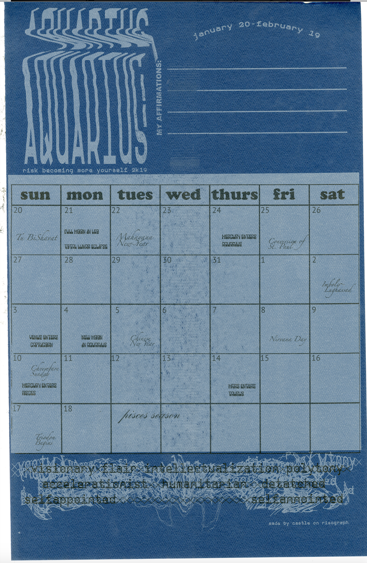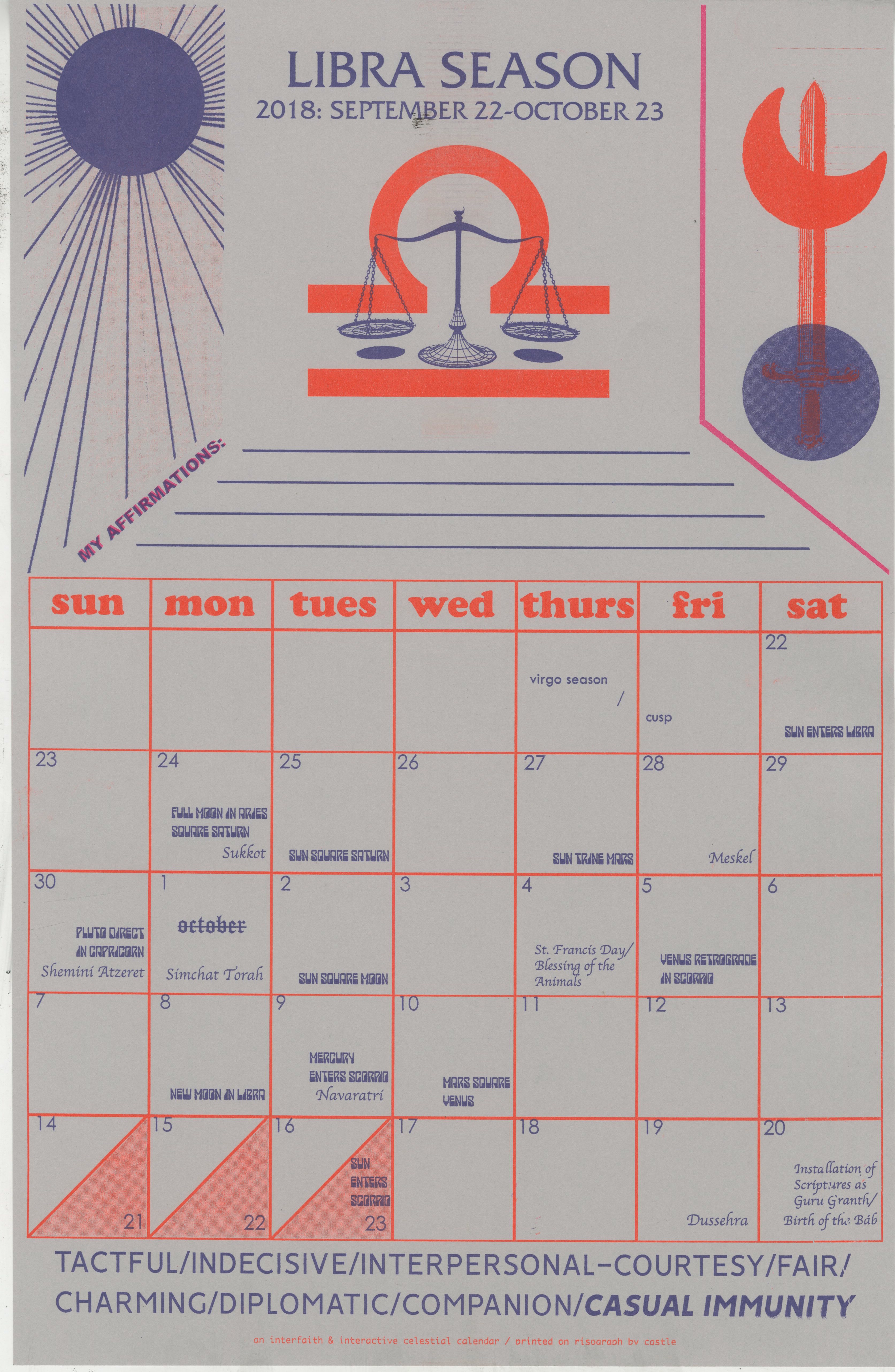 Printed one color at a time on risograph printers; designs made in Photoshop, and the calendar is constructed in InDesign.